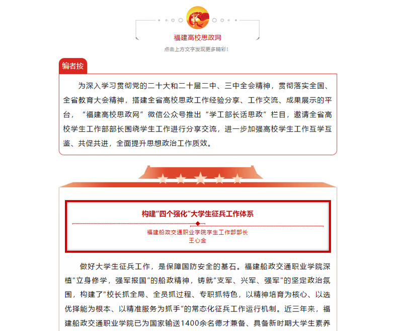 為深入學習貫徹黨的二十大和二十屆二中、三中全會精神,貫徹落實全國、全省教育大會精神,搭建全省高校思政工作經(jīng)驗分享、工作交流、成果展示的平臺,“福建高校思政網(wǎng)”微信公眾號推出“學工部長話思政”欄目,邀請全省高校學生工作部部長圍繞學生工作進行分享交流,進一步加強高校學生工作互學互鑒、共促共進,全面提升思想政治工作質(zhì)效。