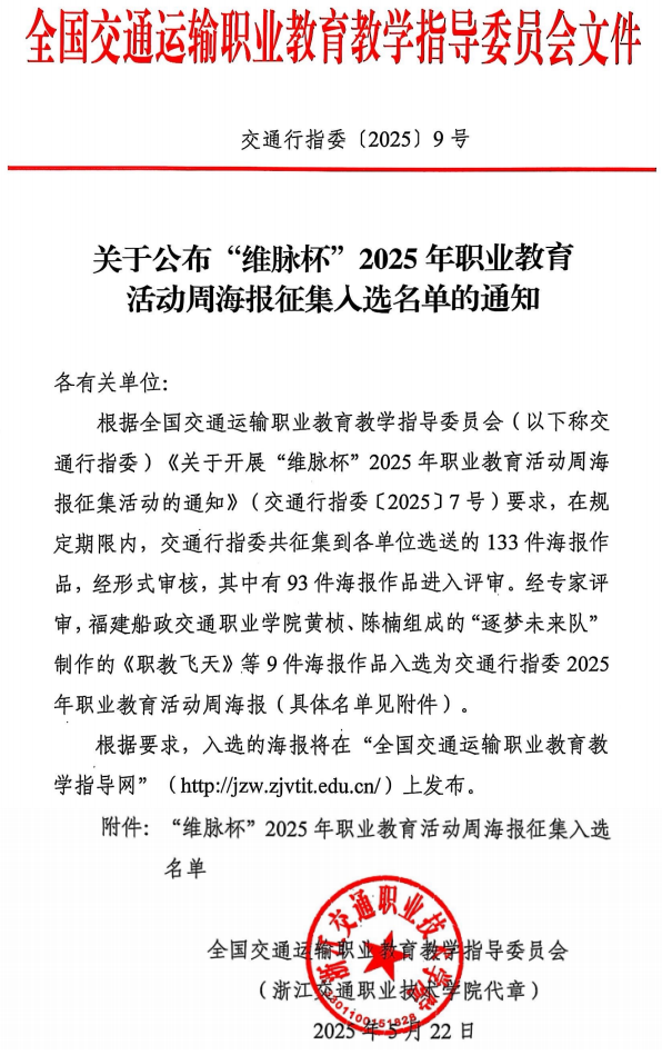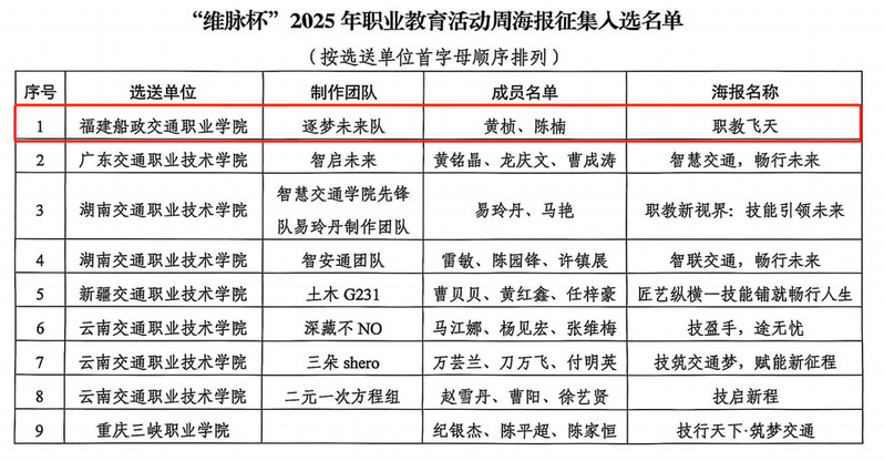 近期,全國(guó)交通運(yùn)輸職業(yè)教育教學(xué)指導(dǎo)委員會(huì)(以下稱(chēng)交通行指委)正式公布了2025年職業(yè)教育活動(dòng)周海報(bào)征集結(jié)果,由經(jīng)濟(jì)與管理學(xué)院黃楨、陳楠兩名同學(xué)組成的“逐夢(mèng)未來(lái)隊(duì)”(指導(dǎo)老師官源)創(chuàng)作的海報(bào)作品,從全國(guó)133件參賽作品中脫穎而出,成功入選最終9件優(yōu)秀作品之列。這些入選的海報(bào)作品將在“全國(guó)交通運(yùn)輸職業(yè)教育教學(xué)指導(dǎo)網(wǎng)”進(jìn)行集中展示。