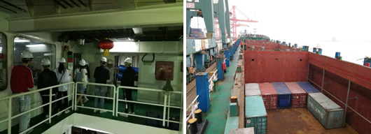 圖11 參觀機艙 圖12 觀看裝卸船作業(yè)