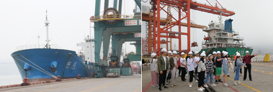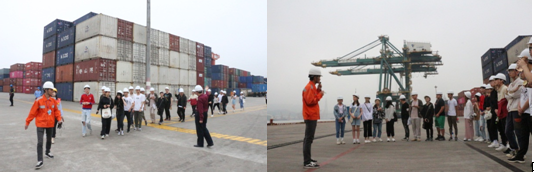 在海盈碼頭工作人員的引導下,同學們有序進入碼頭前沿,由海盈碼頭操作部經(jīng)理助理王勇介紹碼頭的安全注意事項,并利用碼頭的資源,向?qū)W生介紹集裝箱、碼頭構造、機械設備、艙蓋板和倉庫等方面的知識,也詳細介紹了集裝箱在碼頭內(nèi)部的整個流轉(zhuǎn)過程。