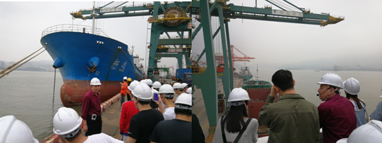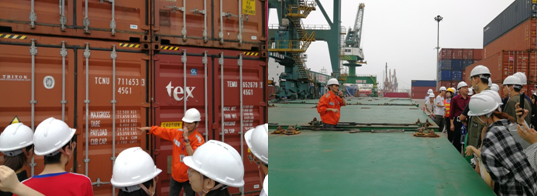 陳宏主任利用正在裝卸的集裝箱船,對同學們進行現(xiàn)場教學,講解船舶的基本知識,如船舶構造和船身標識等,加深同學們對課堂知識的認識和理解。在現(xiàn)場教學的過程中,陳宏主任還與同學們進行了現(xiàn)場互動,對學生進行提問,考查課堂學習的效果