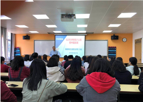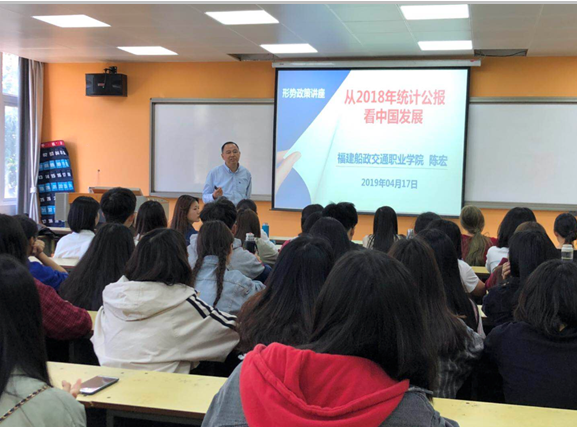 為貫徹落實(shí)《中共福建省委教育工委關(guān)于進(jìn)一步規(guī)范高校形勢與政策課教育教學(xué)工作的通知》(閩委教思〔2017〕13 號(hào))指出,“高校黨委書記、校長和院(系)黨組織書記、院長(系主任)每學(xué)期至少為學(xué)生作一次形勢政策報(bào)告”。根據(jù)《教社科廳函〔2019〕9號(hào)教育部辦公廳關(guān)于印發(fā)<高校“形勢與政策”課教學(xué)要點(diǎn)(2019年上輯)>的通知》,交通經(jīng)濟(jì)系主任于2019年4月17日15:50在31#307教室為交通經(jīng)濟(jì)系會(huì)計(jì)專業(yè)學(xué)生做了一場題為“從2018年統(tǒng)計(jì)公報(bào)看中國發(fā)展”的主題報(bào)告。報(bào)告上陳宏主任從十九大報(bào)告不忘初心,牢記使命,高舉中國特色社會(huì)主義偉大旗幟,決勝全面建成小康社會(huì),奪取新時(shí)代中國特色社會(huì)主義偉大勝利,為實(shí)現(xiàn)中華民族偉大復(fù)興的中國夢不懈奮斗。中國共產(chǎn)黨人的初心和使命,就是為中國人民謀幸福,為中華民族謀復(fù)興。