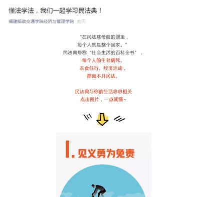 在“引”上做文章,“吹響”宣傳發(fā)動的號聲。通過微信群,微信公眾號等新媒體平臺,推送有關(guān)《民法典》解讀等內(nèi)容,以多元化方式多渠道進行宣傳,做到讓宣傳推廣“跑起來”,讓學(xué)院師生對《民法典》有了初步的了解,引導(dǎo)師生要做學(xué)習(xí)、遵守、維護《民法典》的表率。