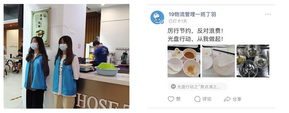 為使光盤行動在教師與學生群體中真正實施到位,并逐步培養(yǎng)不浪費糧食的習慣,此次的光盤活動結合了線上和線下的活動方式,例如通過班級招募“光盤”督導志愿者、舉辦線上“光盤”打卡活動等,吸引了全體經(jīng)管師生參與,使師生們真正將“倡議”化為“行動”、讓“光盤”成為現(xiàn)實。