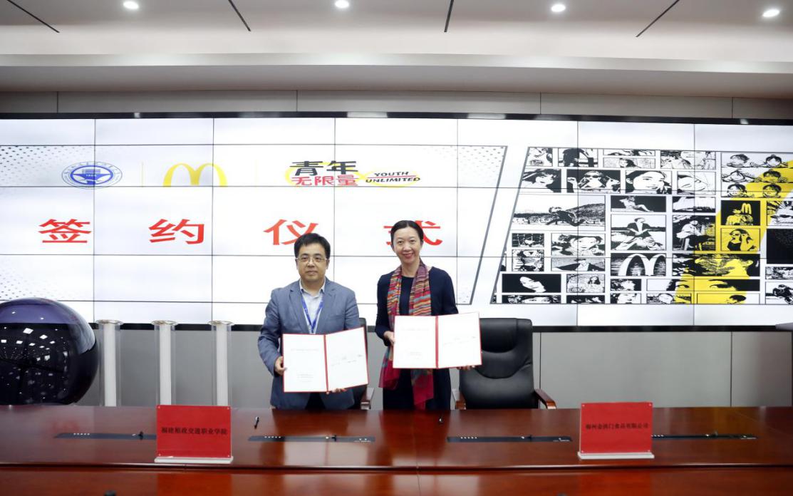 10月21日下午,福建船政交通職業(yè)學(xué)院經(jīng)濟與管理學(xué)院與福州金拱門食品有限公司“現(xiàn)代學(xué)徒制”人才培養(yǎng)項目簽約授牌儀式在學(xué)院隆重舉行。本次活動由經(jīng)濟與管理學(xué)院副院長林穎主持,福建船政交通職業(yè)學(xué)院副院長高汝武,學(xué)生處處長王心金,團委書記陳慧,經(jīng)濟與管理學(xué)院黨總支書記俞素平,經(jīng)濟與管理學(xué)院院長房曰榮,經(jīng)濟與管理學(xué)院黨總支副書記林麗萍,經(jīng)濟與管理學(xué)院副院長吳吉明,經(jīng)濟與管理學(xué)院各教研室主任,福建麥當(dāng)勞高級總經(jīng)理嚴(yán)平,營運總監(jiān)盧雯麗,麥當(dāng)勞領(lǐng)導(dǎo)力學(xué)院院長方方以及麥當(dāng)勞部分餐廳總經(jīng)理出席了此次活動。