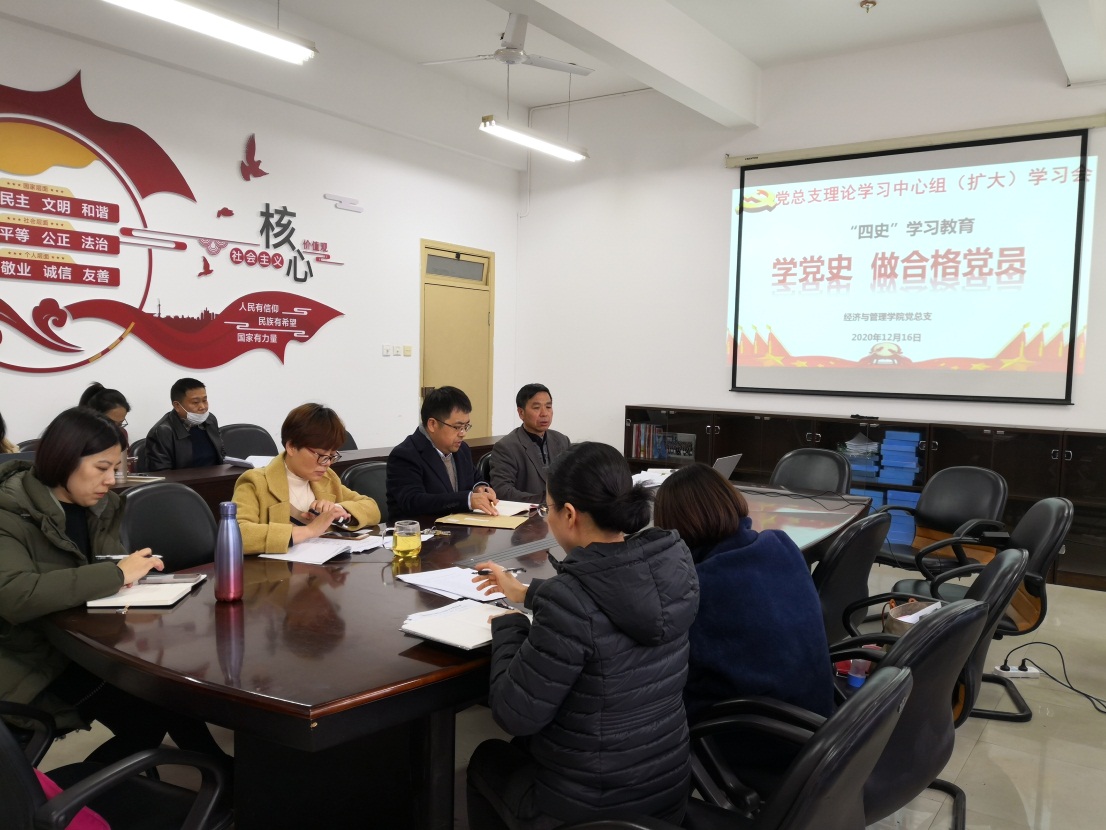學習黨史、新中國史、改革開放史、社會主義發(fā)展史是牢記黨的初心使命的重要途徑,是黨員的一門重要必修課,也是愛國主義教育的重要組成部分。為推動全院黨員、干部不忘歷史、不忘初心、知史愛黨、知史愛國,12月16日下午,經(jīng)管學院在南區(qū)31號樓412會議室召開黨總支理論學習中心組(擴大)會,開展“四史”學習教育之“學黨史 做合格黨員”學習會,學院領導班子、黨總支全體成員、院辦主任、各支部書記、各教研室主任、實訓中心主任參加學習會。會議由黨總支書記俞素平主持。