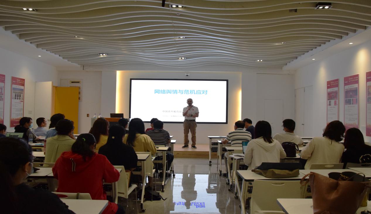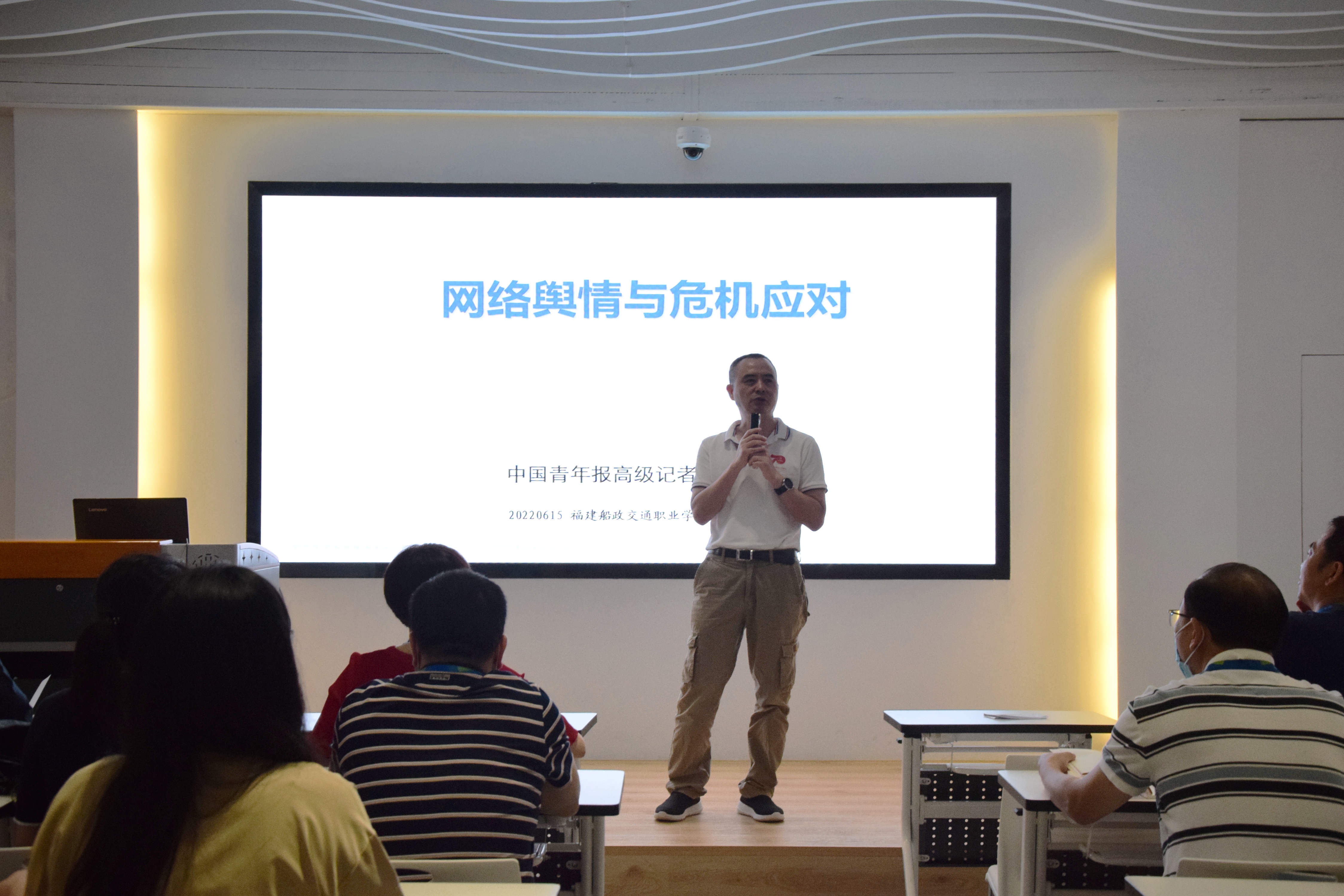 為深入學(xué)習(xí)貫徹習(xí)近平總書(shū)記關(guān)于宣傳思想工作的重要思想,嚴(yán)格落實(shí)意識(shí)形態(tài)工作責(zé)任制,進(jìn)一步提升我院教師媒介素養(yǎng)和輿情處置能力,6月15日上午,我院舉辦意識(shí)形態(tài)工作專(zhuān)題培訓(xùn),《中國(guó)青年報(bào)》高級(jí)記者陳強(qiáng)應(yīng)邀作題為《網(wǎng)絡(luò)輿情與危機(jī)應(yīng)對(duì)》專(zhuān)題授課。院黨政領(lǐng)導(dǎo)班子、教研室主任、支部委員、部分專(zhuān)任教師、全體輔導(dǎo)員參加此次培訓(xùn)。培訓(xùn)由黨總支副書(shū)記林麗萍主持。