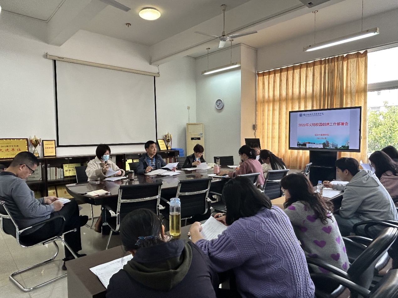 福建船政交通學院經(jīng)濟與管理學院2023年度文明校園創(chuàng)建工作部署會于3月13日召開,全面部署推進文明校園創(chuàng)建工作。會議由俞素平書記主持,二級學院領導及各部門負責人出席會議。