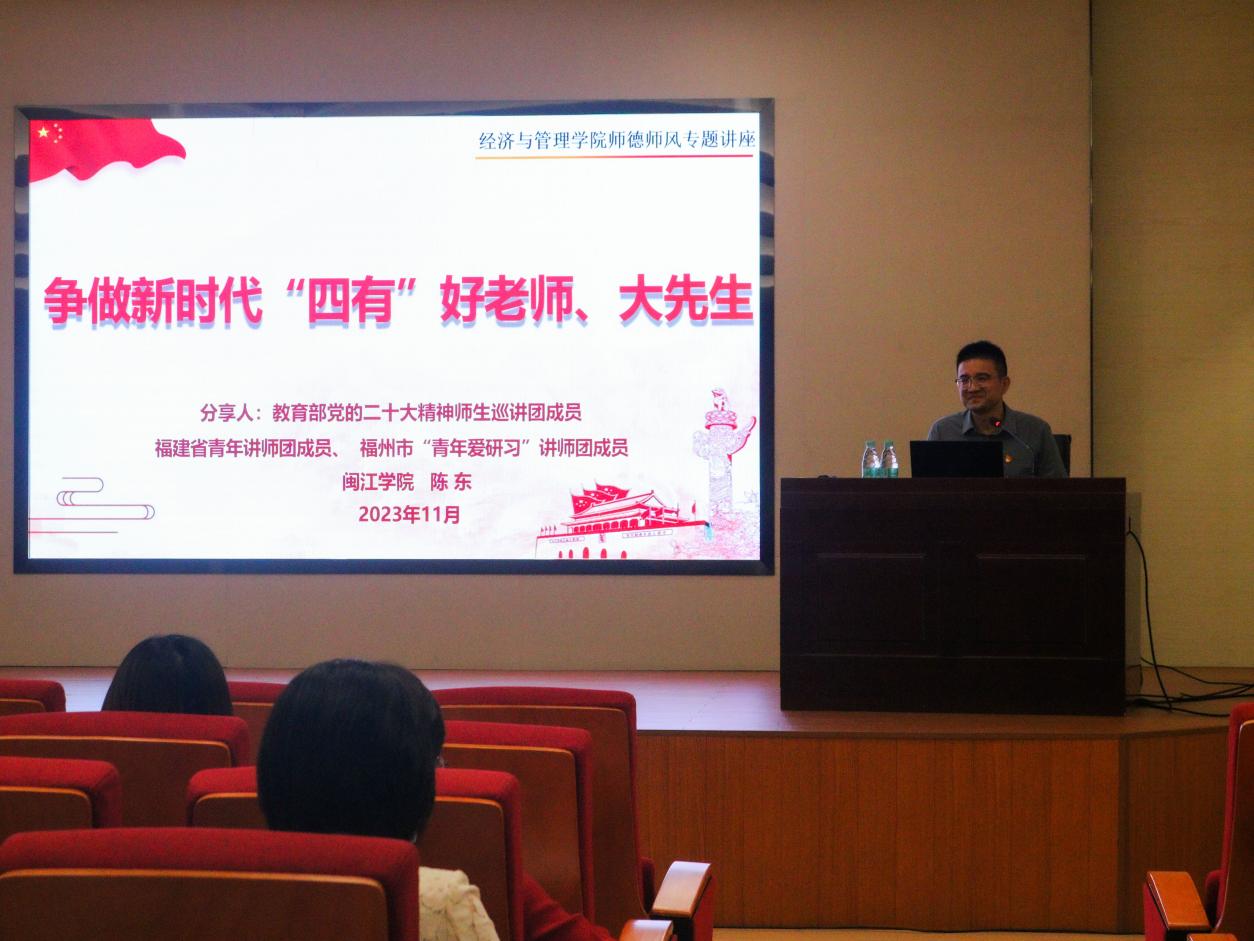 為深入貫徹落實(shí)黨的二十大精神,引導(dǎo)廣大教職工堅(jiān)定理想信念、陶冶道德情操、涵養(yǎng)扎實(shí)學(xué)識、勤修仁愛之心,進(jìn)一步發(fā)揮教師的積極性、主動性、創(chuàng)造性,全面落實(shí)立德樹人根本任務(wù),2023年11月8日,經(jīng)濟(jì)與管理學(xué)院開展2023年師德師風(fēng)專題講座,特邀全國模范教師陳東作《爭做新時(shí)代“四有”好老師、大先生》專題報(bào)告。