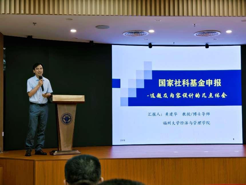 活動(dòng)邀請(qǐng)了福州大學(xué)經(jīng)濟(jì)與管理學(xué)院黃建華教授作主題講座。黃建華教授是福州大學(xué)物流研究院副院長、福建省高層次人才、博士生導(dǎo)師。國家社科基金通訊評(píng)審專家,福建省、湖南省、河北省、江西省等省份的自然科學(xué)基金項(xiàng)目函評(píng)專家;兼任教育部學(xué)位中心博士論文、碩士論文評(píng)審專家,福建省政府投資項(xiàng)目評(píng)審專家、福州市發(fā)改委項(xiàng)目評(píng)審專家;福建省應(yīng)急廳應(yīng)急管理專家。講座以“國家社科基金申報(bào)”為題,為參會(huì)的博士教師們作了精彩報(bào)告。黃教授圍繞國家社科基金項(xiàng)目的指南走向、選題原則、論證活頁和申報(bào)書撰寫技術(shù)細(xì)節(jié)等視角展開分享。他強(qiáng)調(diào)雖然國社科從課題指南發(fā)布到提交時(shí)間比較短,但中標(biāo)的課題一定是一個(gè)長期思考與積累的結(jié)果。他鼓勵(lì)與會(huì)教師,將個(gè)人學(xué)術(shù)研究興趣與國家和社會(huì)發(fā)展相融合,積極申報(bào),反復(fù)打磨,爭取盡早取得突破。