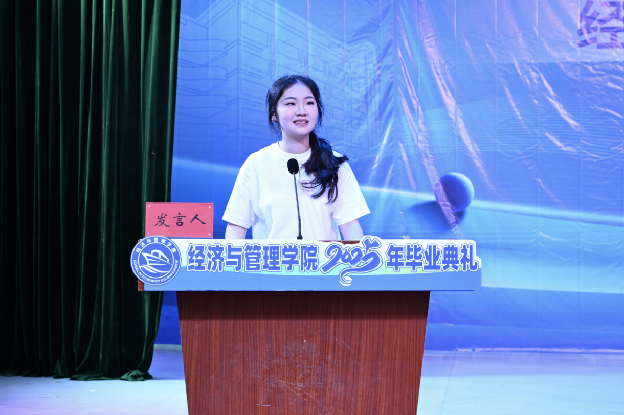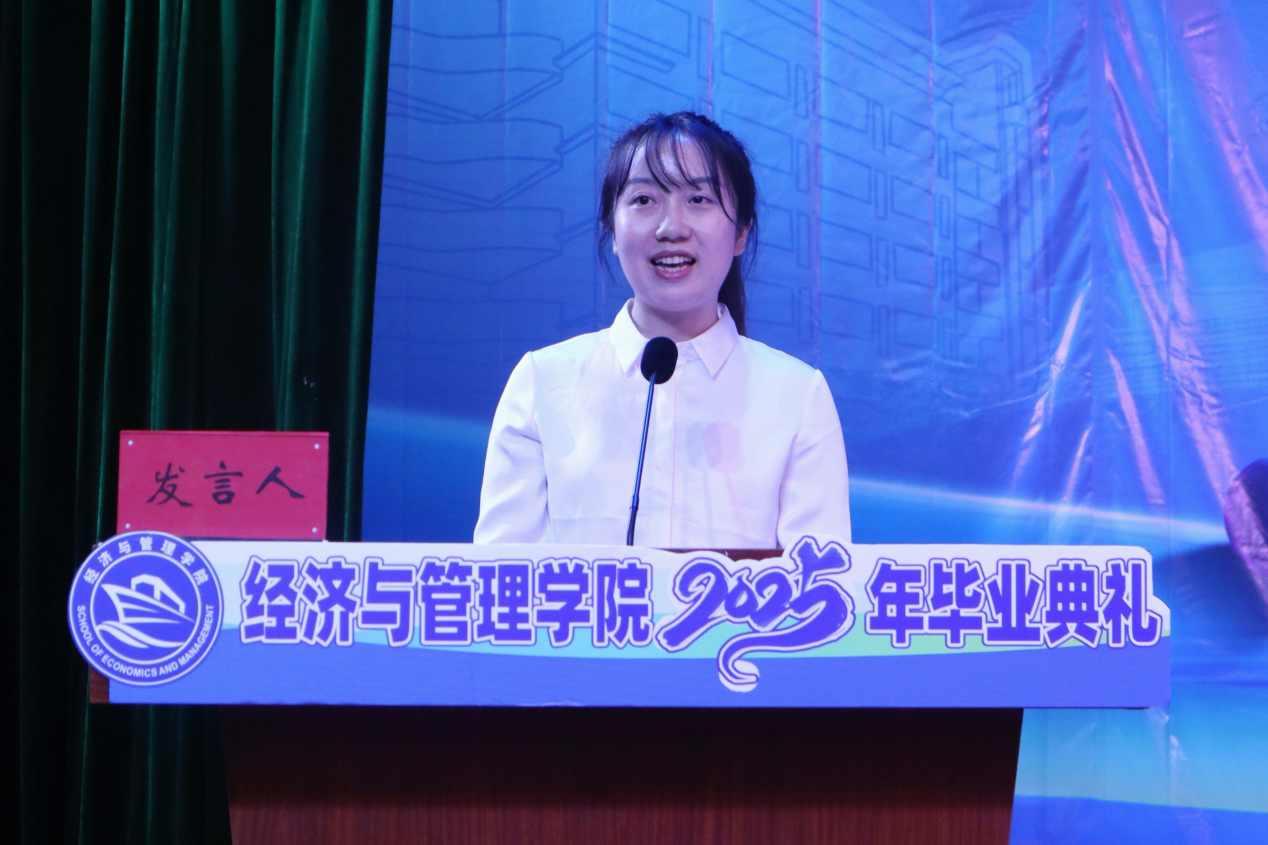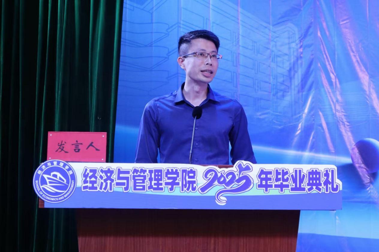 優(yōu)秀教師代表陳邯老師向2025屆畢業(yè)生深情寄語。希望大家以專業(yè)所長服務(wù)社會,又能以人文情懷溫暖他人;既能在平凡崗位中追求卓越,也能在時代浪潮中堅守初心。并對畢業(yè)生提出三點(diǎn)期望:一是“志不求易者成,事不避難者進(jìn)”:愿你們永遠(yuǎn)保持“船政人”敢為人先的銳氣;在時代的浪潮中書寫屬于經(jīng)管人的華章;二是“知者不惑,仁者不憂,勇者不懼”:愿你們在數(shù)字化浪潮中始終葆有人文溫度;三是“此去星辰大海,歸來仍是船政少年”:無論你們走向何方,母校的燈塔永遠(yuǎn)為你們照亮歸航的路。