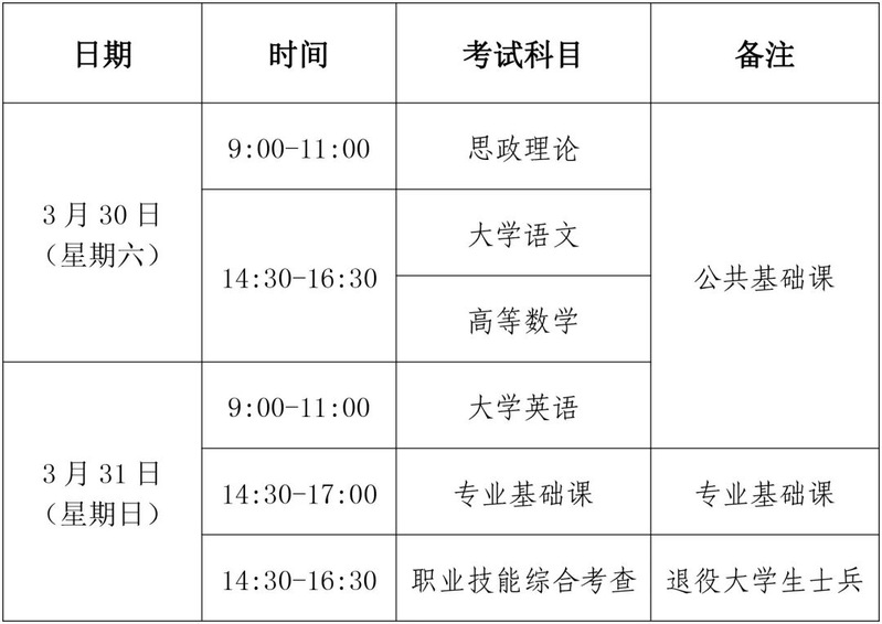 1.普通考生(含選擇本類型的獲獎考生)和脫貧戶家庭考生(含選擇本類型的獲獎考生)的考試安排在2024年3月30日至 31日進(jìn)行??荚嚳颇糠譃楣不A(chǔ)課和專業(yè)基礎(chǔ)課,總分滿分600分。公共基礎(chǔ)課3門,每門滿分100分,每門考試時(shí)長120分鐘,專業(yè)基礎(chǔ)課1門,滿分300分,考試時(shí)長150分鐘。