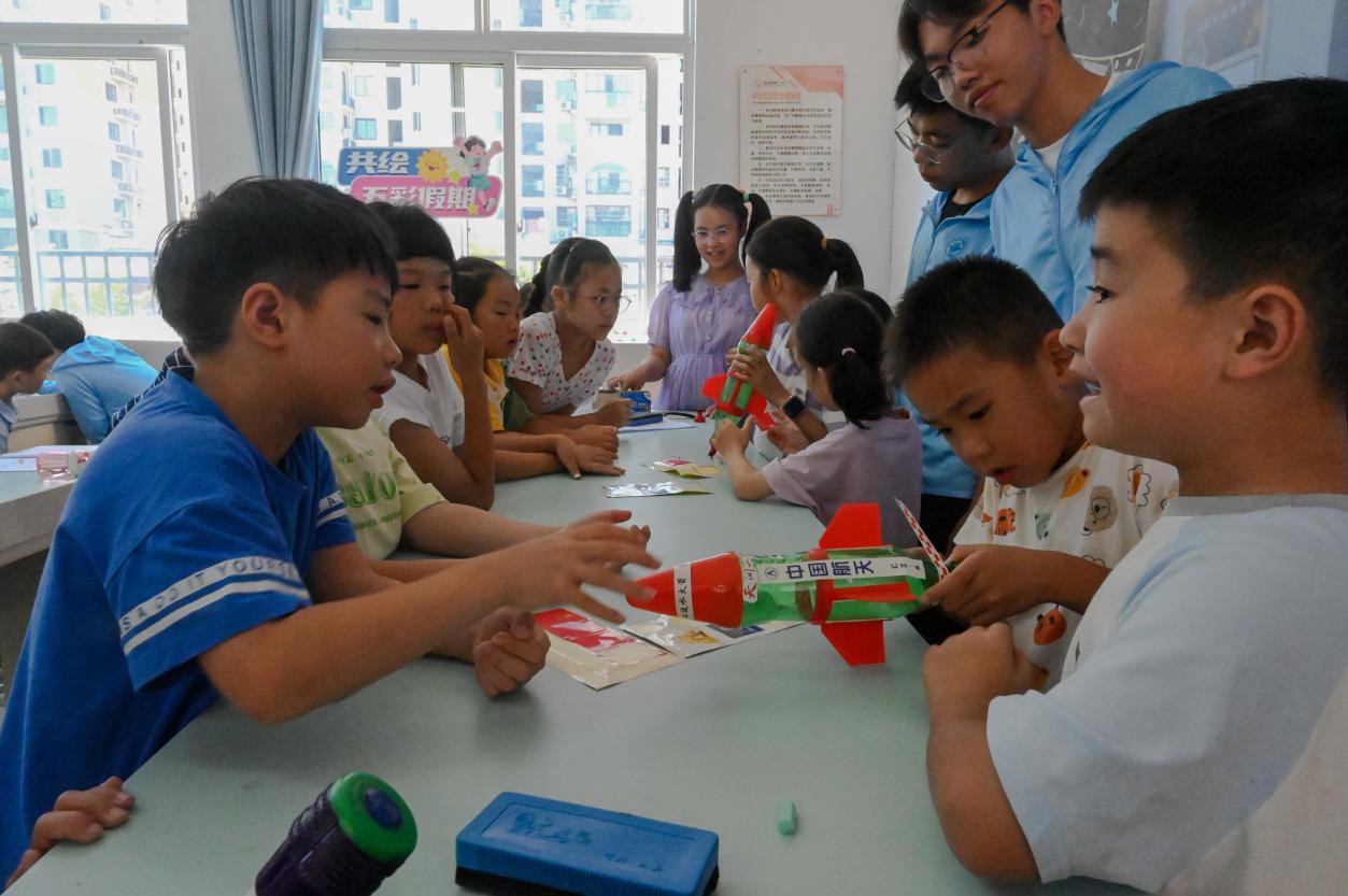 (實踐團成員帶領(lǐng)小朋友們制作火箭發(fā)射器)