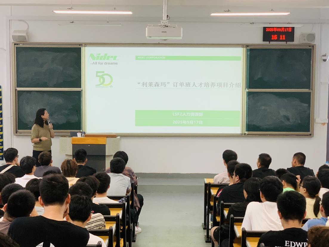 訂單班合作企業(yè)-利萊森瑪電機科技(福州)有限公司企業(yè)人事經理代表企業(yè)上臺發(fā)言。先是介紹了企業(yè)的發(fā)展歷程、行業(yè)地位與核心業(yè)務,讓新生對合作企業(yè)有了全面了解;接著,重點解讀了電氣專業(yè)訂單班的培養(yǎng)體系,包括“校企共同制定人才培養(yǎng)方案”“學生進入企業(yè)實習實訓”等特色環(huán)節(jié),清晰展現了訂單班“工學結合、精準育人”的優(yōu)勢,為新生提供了一條“入學即接軌職場”的成長通道。