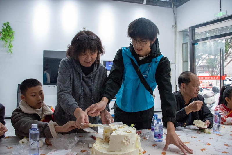 文藝表演結(jié)束后,志愿者們推著精心準備的祝福蛋糕緩緩入場,點亮象征吉祥安康的蠟燭。伴隨著全場齊唱的溫馨生日歌,長者們閉上眼睛許下美好心愿。志愿者們細心地將蛋糕切塊分裝,逐一送到每位老人手中,蹲在老人身邊陪伴他們品嘗甜蜜滋味,輕聲交流家常,讓老人們在歡聲笑語中感受家人般的關(guān)懷。