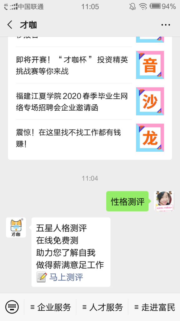 參加性格測評:關注“才咖”公眾號(微信號:caika007),發(fā)送關鍵字“性格測評”,點“馬上測評”,開始進行免費性格測評,,獲得測評報告。