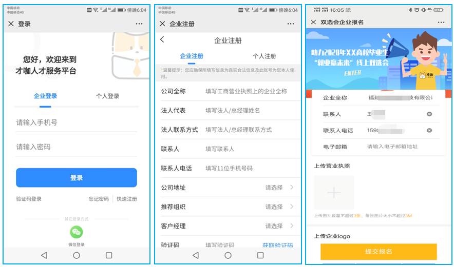 企業(yè)報名需要提交、上傳以下有效信息:企業(yè)營業(yè)執(zhí)照,企業(yè)法人姓名、聯(lián)系方式,招聘負責人姓名、聯(lián)系方式,發(fā)布真實招聘崗位。