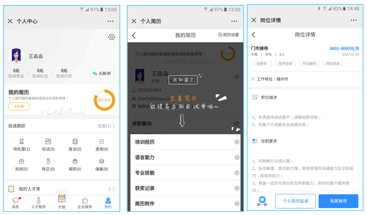 點“我的簡歷”→填寫具體信息→進行在線個人簡歷投遞