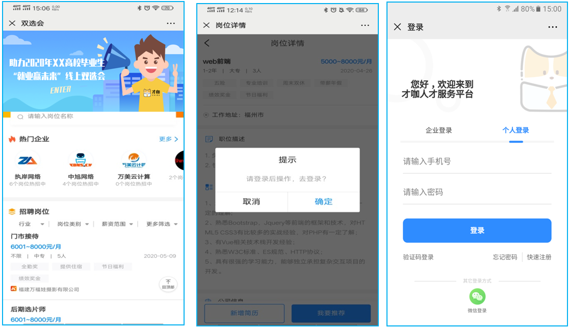 通過審核企業(yè)在“才咖”人才服務平臺發(fā)布崗位信息,即可參與招聘會,同時可報名參加企業(yè)空中宣講會;