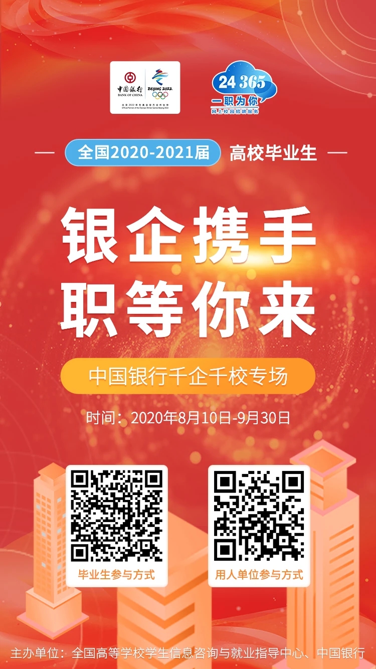 8月10日,教育部全國就業(yè)指導(dǎo)中心聯(lián)合中國銀行,面向2020-2021屆高校畢業(yè)生,推出“銀企攜手 職等你來”千企千校網(wǎng)上招聘會。本次招聘會旨在為已離校未就業(yè)的畢業(yè)生提供持續(xù)就業(yè)服務(wù)。招聘會為期兩個月,提供兩萬余個崗位,覆蓋信息技術(shù)、新能源、新材料、生物醫(yī)藥、高端裝備制造、教育、養(yǎng)老等領(lǐng)域。中國銀行作為用人單位之一參與招聘,招聘崗位萬余個,是招聘規(guī)模最大的機(jī)構(gòu)。高校畢業(yè)生和企業(yè)可訪問教育部大學(xué)生就業(yè)網(wǎng)https://job.ncss.cn/student/jobfair/fairdetails.html?fairId=Y6GHD2cWzFvepAQYmzajbB