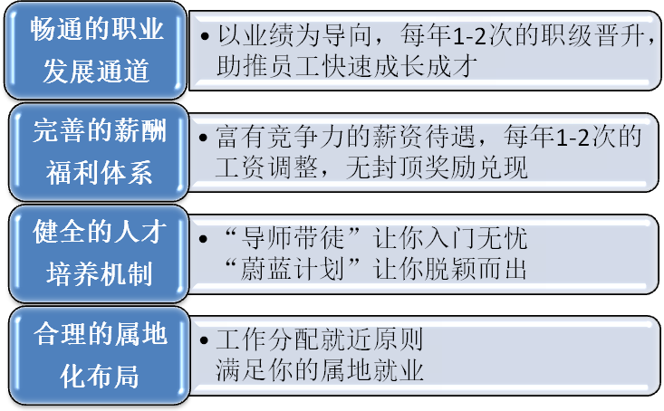 培訓(xùn)培養(yǎng) | 入職培訓(xùn)、導(dǎo)師帶徒、蔚藍計劃、e-Learning網(wǎng)絡(luò)學(xué)習(xí)、內(nèi)部培訓(xùn)、外送培訓(xùn)等 | |