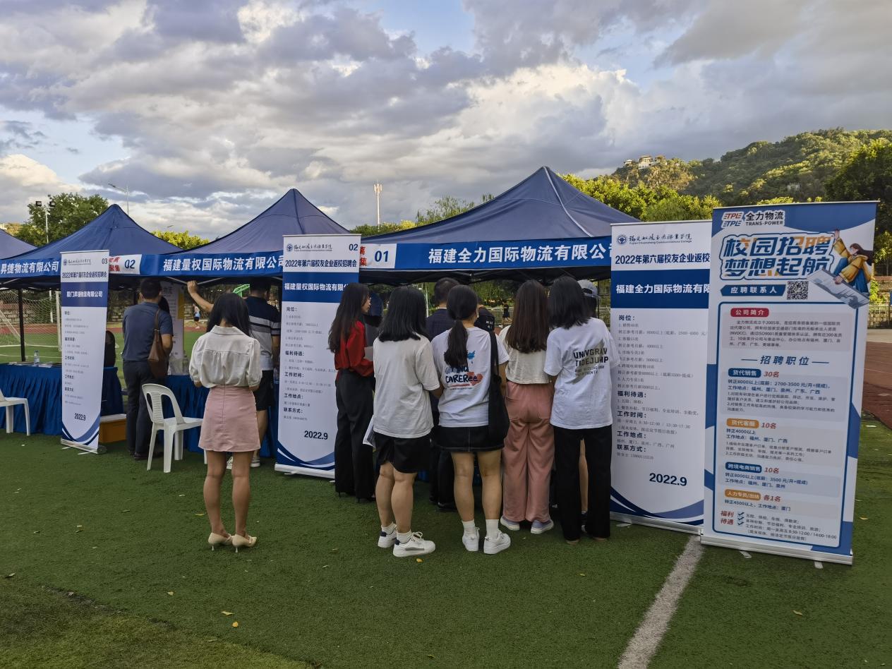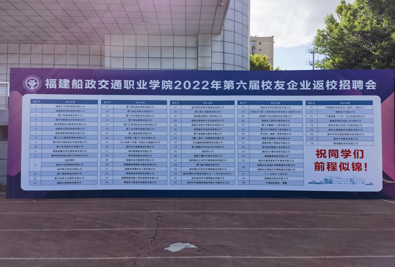 為認(rèn)真貫徹落實(shí)習(xí)近平總書記關(guān)于高校畢業(yè)生就業(yè)的重要指示精神和中央關(guān)于高校畢業(yè)生就業(yè)工作的決策部署,學(xué)院于9月3日下午16:00在南區(qū)田徑場成功舉辦2022年第六屆校友企業(yè)返校招聘會(huì),此次招聘會(huì)由福建船政交通職業(yè)學(xué)院主辦,福建船政交通職業(yè)學(xué)院校友會(huì)及福建省船政文化交流協(xié)會(huì)承辦,共有78家省內(nèi)知名企業(yè)來校參會(huì)。