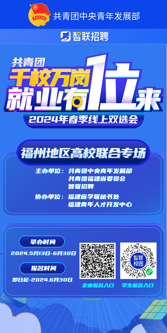為深入貫徹團(tuán)中央促進(jìn)大學(xué)生就業(yè)行動,切實(shí)為畢業(yè)生提供就業(yè)崗位信息、暢通求職渠道、為用人單位和畢業(yè)生搭建供需橋梁,幫助促進(jìn)高校畢業(yè)生更加充分更高質(zhì)量就業(yè)。現(xiàn)舉辦“千校萬崗 就業(yè)有位來”2024年福州地區(qū)高校畢業(yè)生春季聯(lián)合專場線上招聘會,重點(diǎn)面向福州、莆田2024屆及往屆未就業(yè)所有高校畢業(yè)生,誠邀各用人單位及畢業(yè)生報(bào)名參會?,F(xiàn)將有關(guān)事項(xiàng)函告如下: