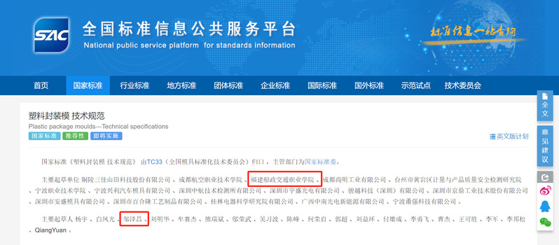 近日,國(guó)家市場(chǎng)監(jiān)督管理總局、國(guó)家標(biāo)準(zhǔn)化管理委員會(huì)發(fā)布中華人民共和國(guó)國(guó)家標(biāo)準(zhǔn)公告(2024年第22號(hào)),以我校作為第三起草單位、省級(jí)技能大師工作室領(lǐng)辦人鄒澤昌作為起草人的國(guó)家標(biāo)準(zhǔn)《塑料封裝模 技術(shù)規(guī)范》(GB/T 14663-2024)獲批發(fā)布,將于2025年4月1日開始實(shí)施。該標(biāo)準(zhǔn)是我校中國(guó)特色高水平高職學(xué)校建設(shè)的又一項(xiàng)重要成果。