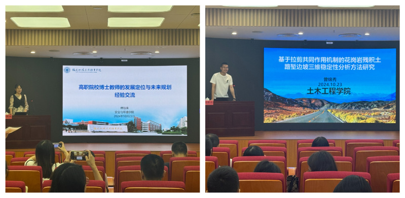在活動的分享發(fā)言環(huán)節(jié),安全與環(huán)境學(xué)院傅鈺瑛博士和土木工程學(xué)院曾錦秀博士分別以《高職院校博士教師的發(fā)展定位與未來規(guī)劃經(jīng)驗交流》和《基于拉剪共同作用機制的花崗巖殘積土路塹邊坡三維穩(wěn)定性分析方法研究》為主題做經(jīng)驗分享,多位博士教師就項目研究及課題申報中遇到的瓶頸和疑問與陳教授展開積極互動,進(jìn)行交流研討。