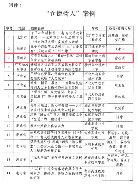 近日,中國職業(yè)技術教育學會發(fā)布《關于公布職業(yè)教育“立德樹人”、解決產(chǎn)業(yè)發(fā)展問題、“職教出?!?、非遺成果轉(zhuǎn)化案例名單的通知》,我院報送的《燈塔型航海人才“技能+素養(yǎng)”雙適任育訓范式創(chuàng)新實踐》《古船新造:福船非遺技藝的創(chuàng)造性轉(zhuǎn)化與職業(yè)教育賦能的活態(tài)創(chuàng)新模式》分別入選“立德樹人”和“非遺成果轉(zhuǎn)化”典型案例。
