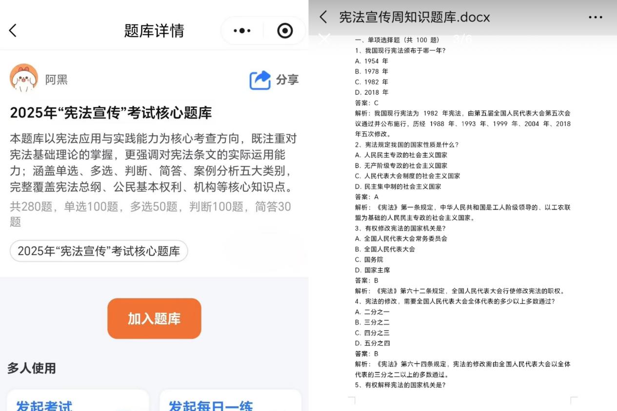12月1日當(dāng)天,汽車學(xué)院以線上答題平臺(tái)為依托,圍繞憲法基礎(chǔ)知識(shí),涵蓋憲法的歷史沿革、基本內(nèi)容、公民的基本權(quán)利和義務(wù)、國家機(jī)構(gòu)以及學(xué)生學(xué)習(xí)生活、汽車行業(yè)相關(guān)的法律法規(guī)等方面,組建知識(shí)答題題庫,設(shè)置了單選題、多選題、判斷題等多種題型,同時(shí)針對(duì)易錯(cuò)題還增設(shè)了答案解析,有效幫助廣大同學(xué)深化對(duì)憲法內(nèi)容的理解,共計(jì)133名同學(xué)參加了答題活動(dòng)。