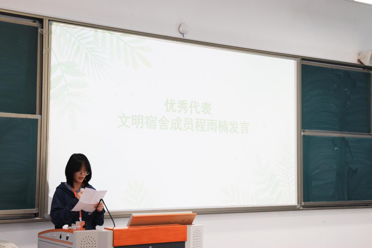 在交流分享環(huán)節(jié),獲獎(jiǎng)宿舍代表程雨楠結(jié)合日常管理經(jīng)驗(yàn),從衛(wèi)生維護(hù)、安全值守、學(xué)風(fēng)共建、團(tuán)隊(duì)協(xié)作等方面展開分享。在她看來,文明宿舍的建設(shè)離不開“分工明確、互相包容”的相處之道,更得益于“勤學(xué)互助、共同進(jìn)步”的良好氛圍,小小的宿舍不僅是生活居所,更是錘煉品德、共同成長的“第二課堂”。