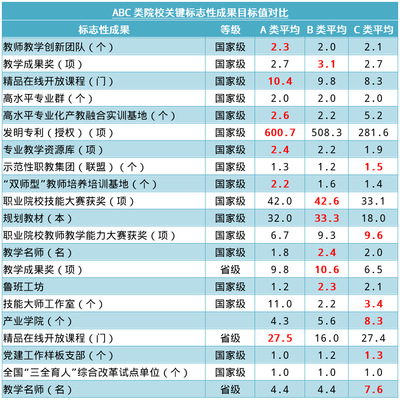 ABC三類院校關(guān)鍵標(biāo)志性成果目標(biāo)設(shè)置對(duì)比:
