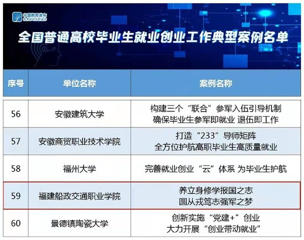 2021年11月26日,教育部發(fā)布公告,公布了100個全國普通高校畢業(yè)生就業(yè)創(chuàng)業(yè)工作典型案例,我院《養(yǎng)立身修學報國之志 圓從戎篤志強軍之夢》案例成功入選,成為福建省唯一入選的高職院校。