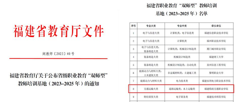 7月12日,福建省教育廳印發(fā)《關于公布省級職業(yè)教育“雙師型”教師培訓基地(2023-2025年)的通知》,我校依托航海技術(shù)高水平專業(yè)群,獲批福建省職業(yè)教育“雙師型”教師培訓基地(2023-2025年),開展水上運輸類的“雙師型”教師培訓與實踐。福建省職業(yè)教育“雙師型”教師培訓基地是我省職業(yè)院校教師發(fā)展體系的重要組成部分,是承擔省級及以上職業(yè)院校教師素質(zhì)提高計劃培訓任務的重要載體。