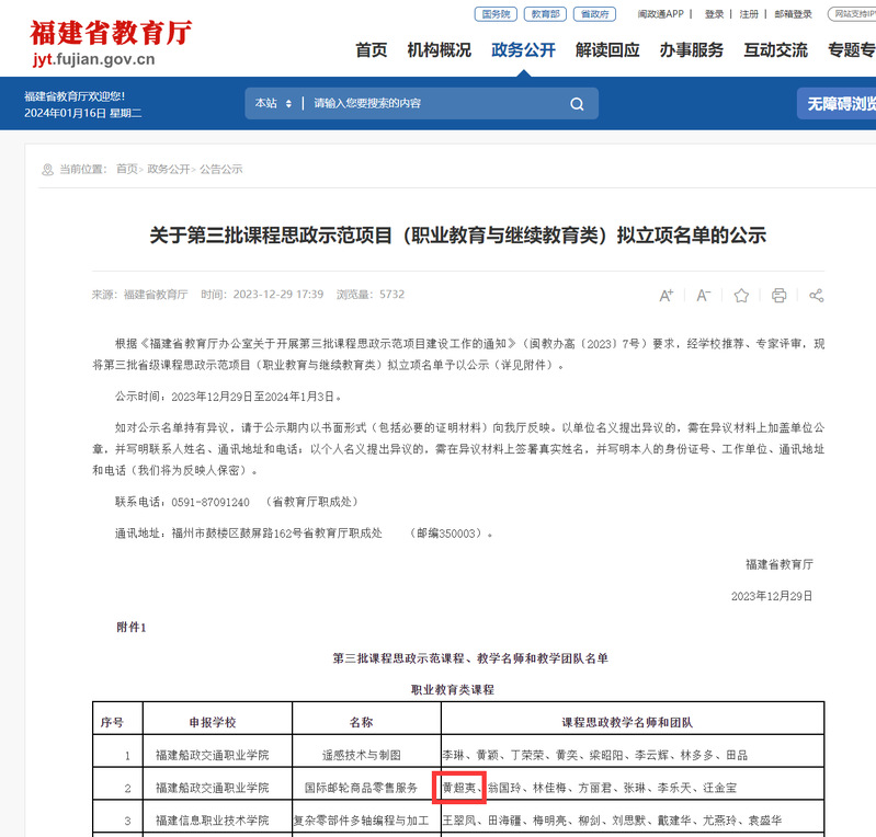 近日,福建省教育廳公布第三批課程思政示范項目(職業(yè)教育與繼續(xù)教育類)名單,由航海技術(shù)專業(yè)群骨干教師黃超夷主持的《國際游輪商品零售服務(wù)》課程獲批省級課程思政示范課程。