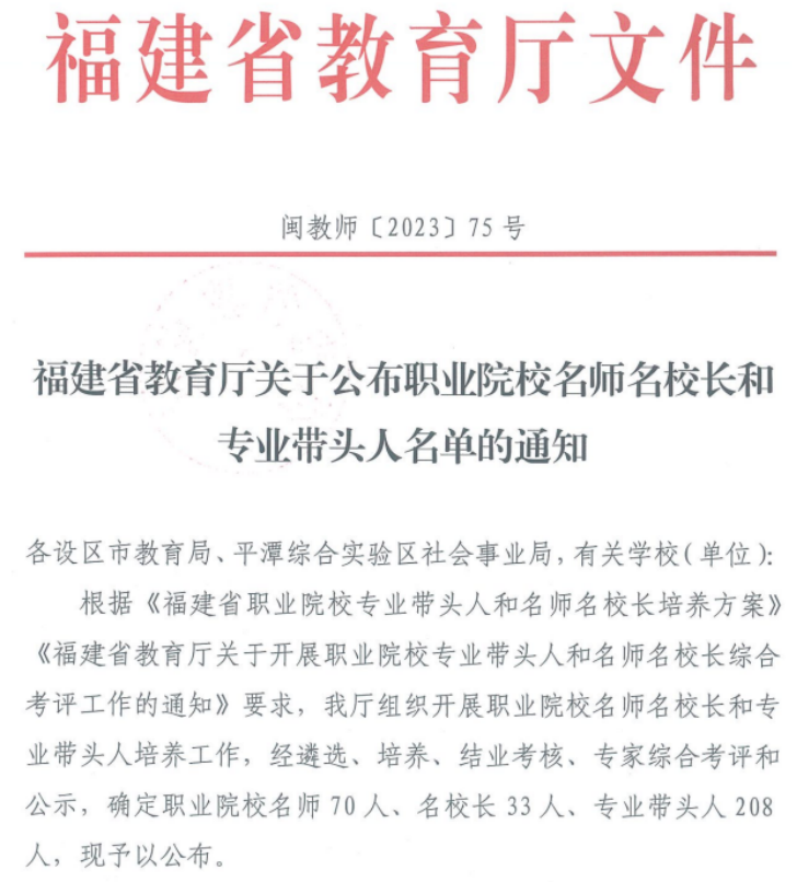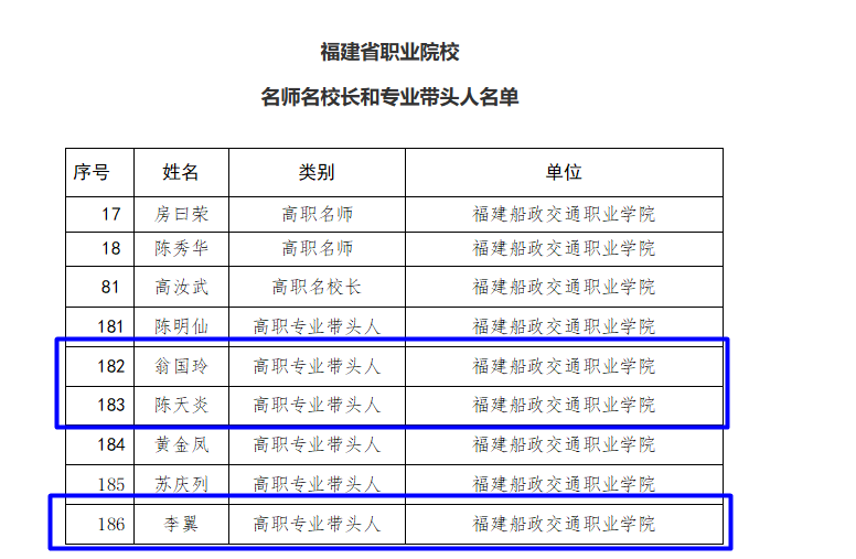 近日,《福建省教育廳關(guān)于公布職業(yè)院校名師名校長和專業(yè)帶頭人名單的通知》(閩教師〔2023〕75號)印發(fā),經(jīng)省教育廳遴選、培養(yǎng)、結(jié)業(yè)考核、專家綜合考評和公示,航海技術(shù)專業(yè)群翁國玲、陳天炎、李翼被確定為福建省高職院校專業(yè)帶頭人。
