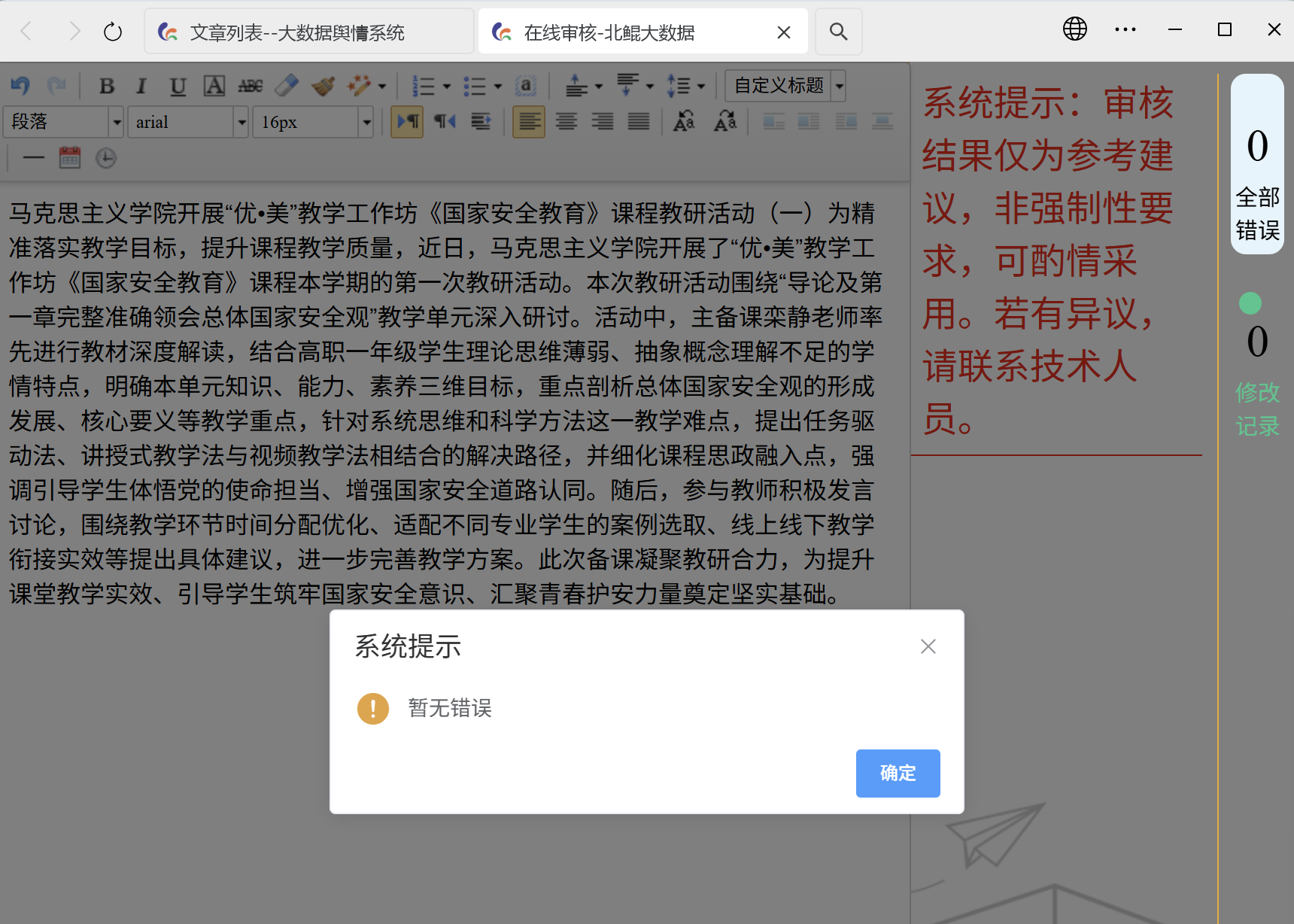 隨后,參與教師積極發(fā)言討論,圍繞教學(xué)環(huán)節(jié)時間分配優(yōu)化、適配不同專業(yè)學(xué)生的案例選取、線上線下教學(xué)銜接實效等提出具體建議,進一步完善教學(xué)方案。此次備課凝聚教研合力,為提升課堂教學(xué)實效、引導(dǎo)學(xué)生筑牢國家安全意識、匯聚青春護安力量奠定堅實基礎(chǔ)。