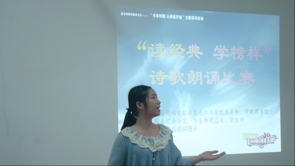 3月22日,圖書館“書香校園從閱讀開始”第四屆讀書月系列活動“讀經(jīng)典學(xué)榜樣”詩歌朗誦比賽在圖書館9樓活動室舉行。全院近30名選手報名參加了比賽。