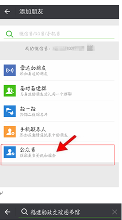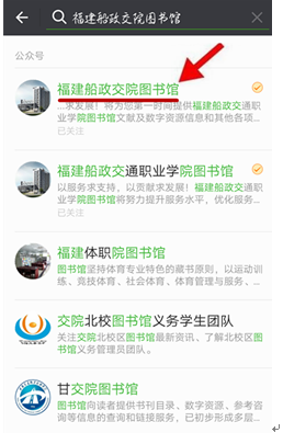 第一步關(guān)注服務(wù)號公眾號:打開微信→添加朋友→公眾號輸入福建船政交院圖書館或掃描二維碼添加