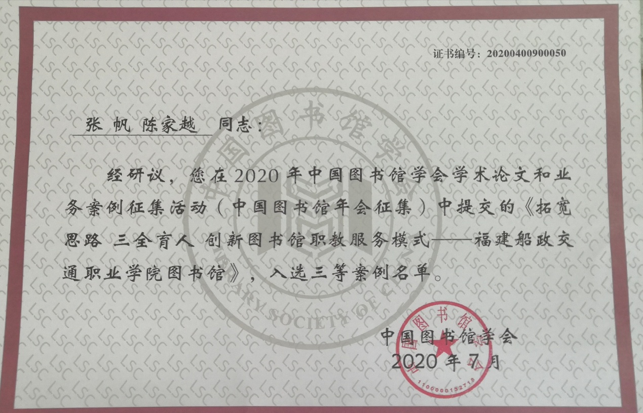 2020年,中國圖書館學會主辦了以“滋養(yǎng)民族心靈 培育文化自信”為主題的中國圖書館學會學術論文和業(yè)務案例征集活動,共設38個分主題,分為“中國圖書館年會征集”和“專題交流活動征集”兩個大類組織實施。本次征集活動共計征集稿件1200余篇,經(jīng)各專家組和研議會綜合評定,我館選送的業(yè)務案例《拓寬思路 三全育人創(chuàng)新圖書館職教服務模式》入選三等案例。