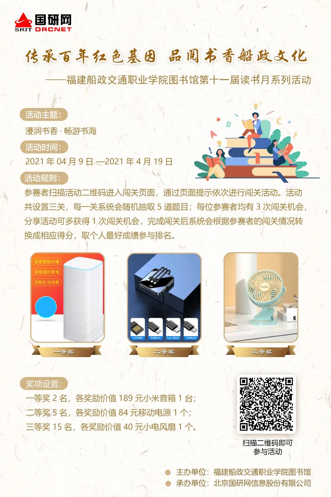 以文化熏陶素養(yǎng),讓書香彌漫人生,隨著4.23世界讀書日的來臨,為豐富本次讀書節(jié)廣大讀者的精神文化生活,讓讀者樂享“文化大餐”,圖書館聯(lián)合北京國研網(wǎng)信息股份有限公司特舉辦“浸潤書香·暢游書?!本€上答題闖關(guān)活動(dòng)。