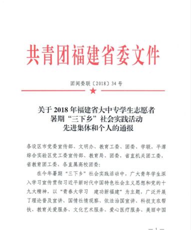 祝賀我館思源志愿隊在2018暑期三下鄉(xiāng)活動中獲得共青團福建省委授予的省級優(yōu)秀團隊榮譽稱號