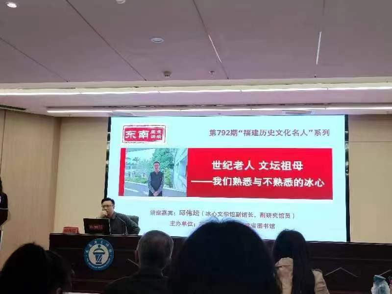 同時,圖學聯(lián)志愿者們還觀摩了福建省圖書館“東南周末講壇”開設的冰心專題講座,應邀了冰心文學館副館長邱偉壇到現(xiàn)場為大家作《世紀老人 文壇祖母——我們熟悉與不熟悉的冰心》的專題講座,吸引了百余名聽眾。