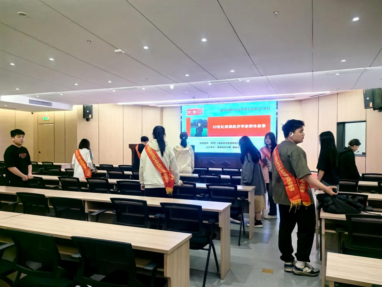 同學(xué)們在志愿服務(wù)的同時,還觀摩了福建商學(xué)院國際經(jīng)貿(mào)學(xué)院副教授、博士、福建商學(xué)院閩商研究中心特約研究員林航作“20世紀閩都經(jīng)濟學(xué)家群體敘事”的專題講座。講座講述的是以“船政人物”嚴復(fù)為代表的閩都經(jīng)濟學(xué)家發(fā)揚斗爭精神,賡續(xù)閩學(xué)基因,對舶來經(jīng)濟學(xué)說中國化的探索歷程綿延百年,為中國經(jīng)濟學(xué)建設(shè)注入閩學(xué)精神,他們的開創(chuàng)性貢獻值得銘記和緬懷。在講座最后的問答互動環(huán)節(jié)中,林航副教授親切熱情、娓娓道來地回答了同學(xué)們關(guān)注的問題。
