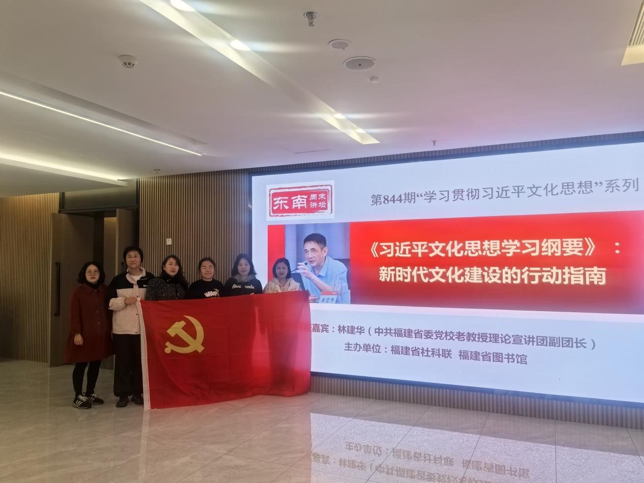 為深入學習貫徹習近平文化思想,深化新時代文化建設理念,2025年3月29日上午,圖書館黨支部全體黨員及十余名學生志愿者赴福建省圖書館,為讀者開展志愿服務及主題黨日活動。參與福建省圖書館《閩圖大學堂》“學習貫徹習近平文化思想”系列講座。