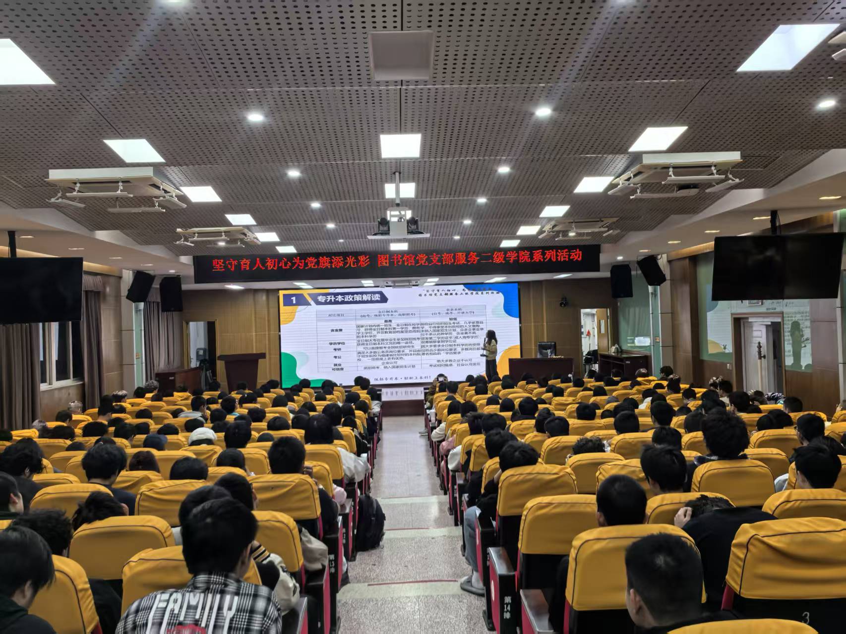 為幫助2025級新生精準(zhǔn)把握專升本政策導(dǎo)向,科學(xué)規(guī)劃學(xué)業(yè)生涯,2025年11月19日晚7時在福道園行政樓6樓學(xué)術(shù)廳,圖書館黨支部開展服務(wù)二級學(xué)院系列活動——舉辦“專升本學(xué)習(xí)規(guī)劃”專題講座。邀請專升本政策規(guī)劃師曾巧霞老師為同學(xué)們作專升本政策解讀與報考指導(dǎo),2025級近300名同學(xué)聆聽了講座。