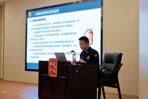 丁偉濱還結合自身在消防救援領域的實踐經歷,圍繞“校園消防安全形勢分析”“消防安全職責及責任追究”“常見隱患問題及整治措施”“初期火災撲救和應急能力建設”四大模塊,通過真實案例、數(shù)據(jù)統(tǒng)計與視頻警示,深入淺出地講解了火災預防、責任落實、隱患整治及應急自救等關鍵知識,強調了“預防為主、防消結合”的消防安全理念。