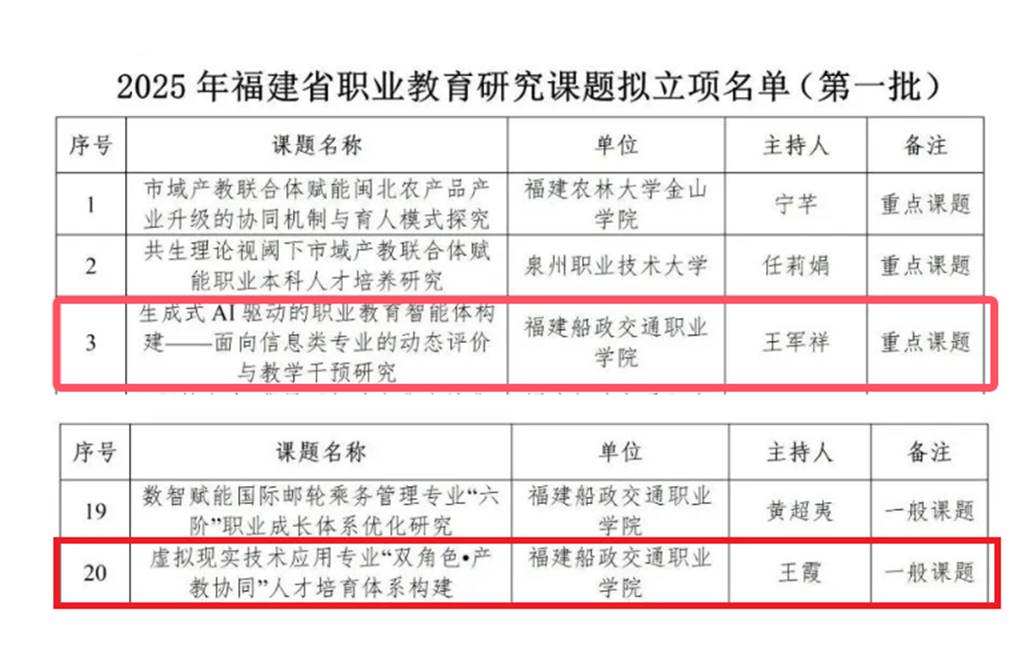 根據(jù)《關(guān)于開展2025年福建省職業(yè)教育研究課題立項申報工作的通知》(閩職教中〔2025〕8號),經(jīng)福建省職業(yè)技術(shù)教育中心組織專家評審、會議研究,王軍祥老師申報的《生成式AI驅(qū)動的職業(yè)教育智能體構(gòu)建-面向信息類專業(yè)的動態(tài)評價與教學干預研究》獲批重點課題立項;我院王霞老師申報的《虛擬現(xiàn)實技術(shù)應用專業(yè)“雙角色?產(chǎn)教協(xié)同”人才培育體系構(gòu)建》獲批一般課題立項。