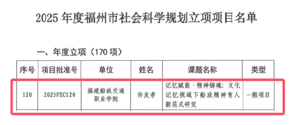 根據(jù)《福州市社會科學規(guī)劃項目管理辦法》,經(jīng)專家組評審,市社科規(guī)劃領(lǐng)導小組審議通過,2025年度福州市社會科學規(guī)劃共立項281個項目,其中我院許友孝老師申報的《記憶賦能·精神鑄魂:文化記憶視域下船政精神育人新范式研究》獲批立項。